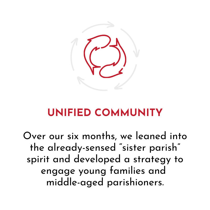 But when I met Fr. Esswein, the pastor of both parishes– I realized that his vision of discipleship was going to make a huge difference in this process of unification. Fr. Esswein is immediately disarming, warm, and dedicated. He began every meeting with prayer, and I could tell he had a personal relationship with everyone who was going to work on this project. Getting to know Father, his vision, and his pastoral love for his parishioners made me realize: this was going to work, and not only that, flourish.