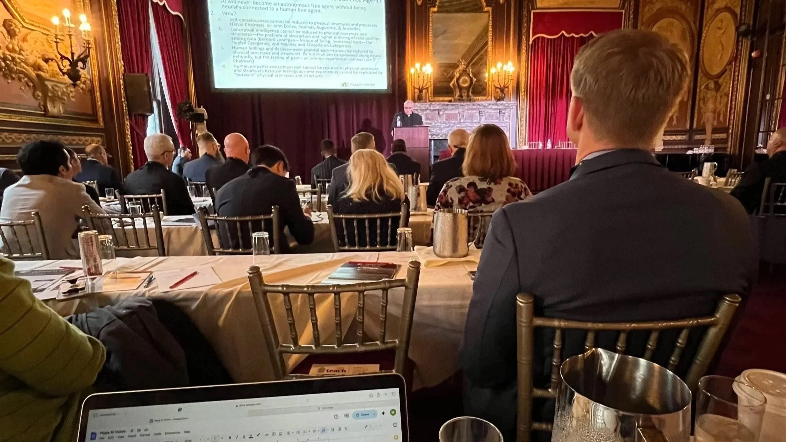 Fr. Robert Spitzer opened with a sobering look at AI’s challenges: the risk of “hallucinations” — false outputs confidently presented as truth — and the growing capacity of deep learning systems. When technology becomes a black box, he warned, our confidence in reality itself can erode. He spoke of privacy threats, bias, and even the danger of an “AI oligarchy” (a small group controlling vast streams of information).